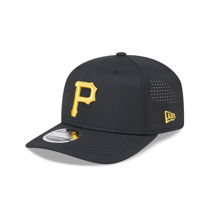 The Pittsburgh Pirates Perform 9SEVENTY Stretch-Snap Hat features an embroidered Pirates logo at the front panels with a matching New Era Flag at the left-wear side. Additional details include a gray undervisor and a snapback closure at the rear.