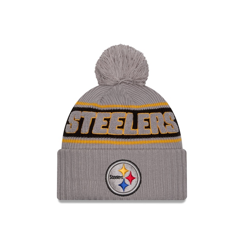 The Pittsburgh Steelers 2024 Cold Weather Gray Pom Knit Hat features an embroidered Steelers logo at the front cuff with a matching NFL Shield at the rear. Additional details include a team wordmark at the crown and a one-time removable pom.