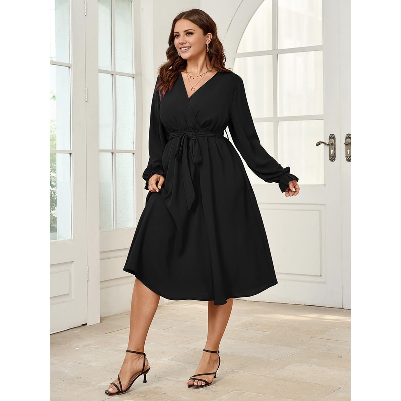 Be the first to review “Plus size evening dress mid length dress winter long sleeved wrap V-neck belt A-line flowing party dress”
