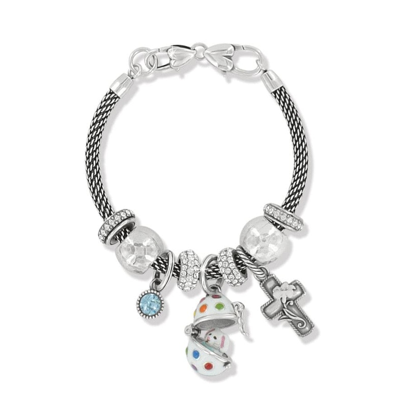 Youll be set for Easter with this charm bracelet that celebrates both faith and fun festivities with a symbol of devotion, Easter egg, a radiant amulet and a silver bead, spacer and stopper.