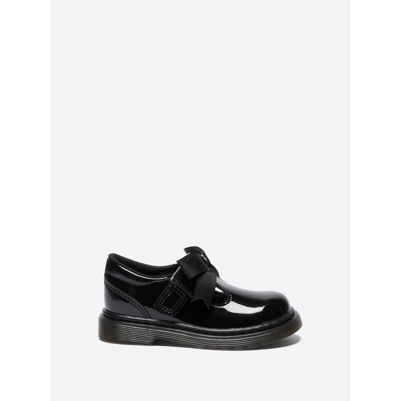 Shined up and bow-tied. The Polley II Bow shoe wraps up durable construction and unapologetic attitude. Black Patent Lamper leather gives the shoe a polished look. Across the upper, youll find a riptape fastening strap, oversized grosgrain bow and a heart-shaped rivet. A wingtip and shaped heel counter sculpt the back of the shoe, and a cemented smoke DMS Kids sole with grooving guarantees comfort with every wear.