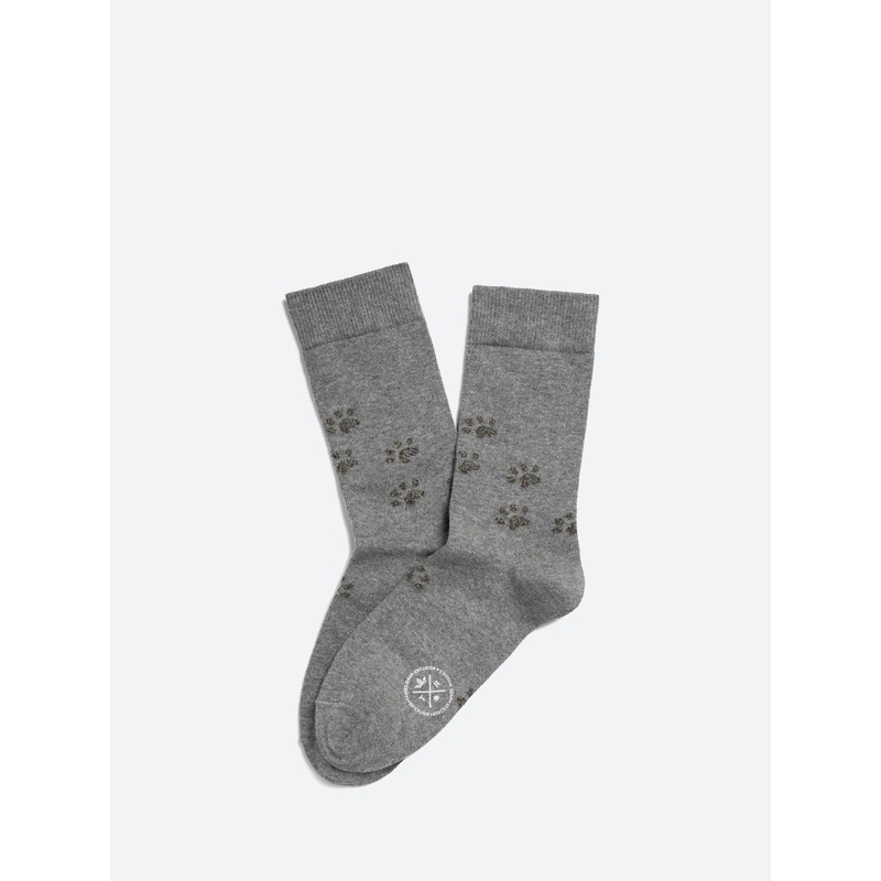 These jacquard socks evoke the traces left by the paws of a cat. The contrast between the matte cotton yarn and lurex shimmer of the pawprints gives this design its playful subtlety.Calf-height socksRibbed cuffsAll-over pawprint designHeight: 22 cmMaterial