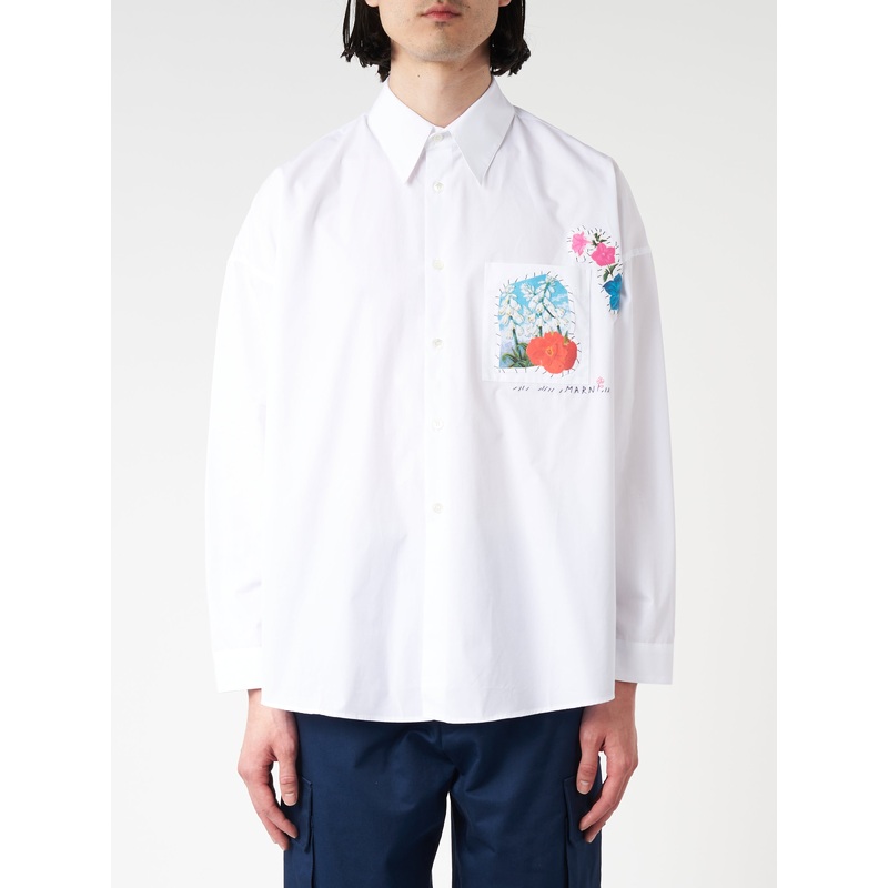 Long-sleeved shirt made from organic cotton poplin. Cut-out flower patches lifted from colourful collage prints. Hand-stitched Marni mending logo with flower detail on the chest pocket.Point collarFront button closureButtoned cuffsFlower patches at the che