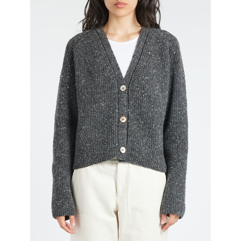 This beautifully knit merino wool cardigan compliments everything. Featuring a cropped and slightly boxy fit, it may just win the title of the perfect cardigan. This plush knit is responsibly made from Donegal Yarns, and is spun to be naturally speckled.V-