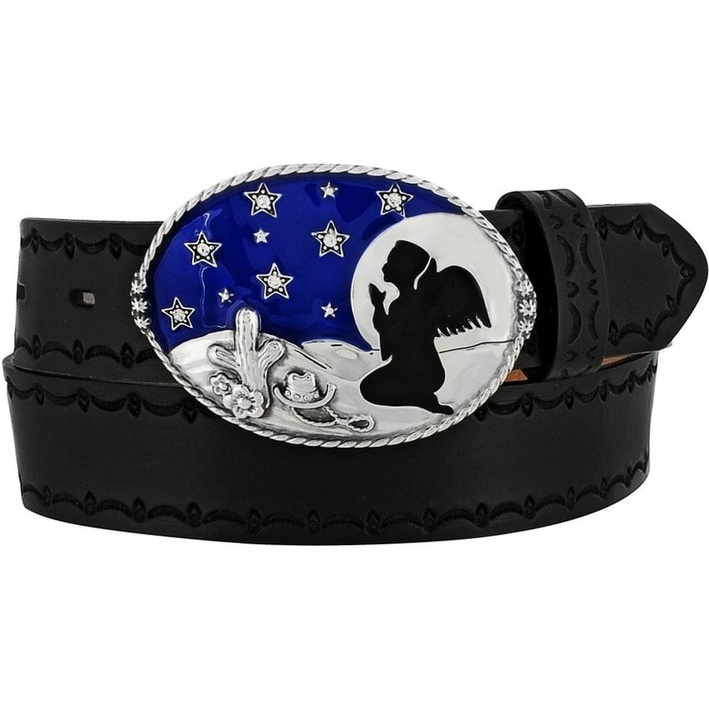 Carry your prayers with you — day or night — whenever you wear this Praying Angel Belt. Its plaque buckle features a Western scene like no other, with cowboy hat, rope, cactus, and kneeling angel.
