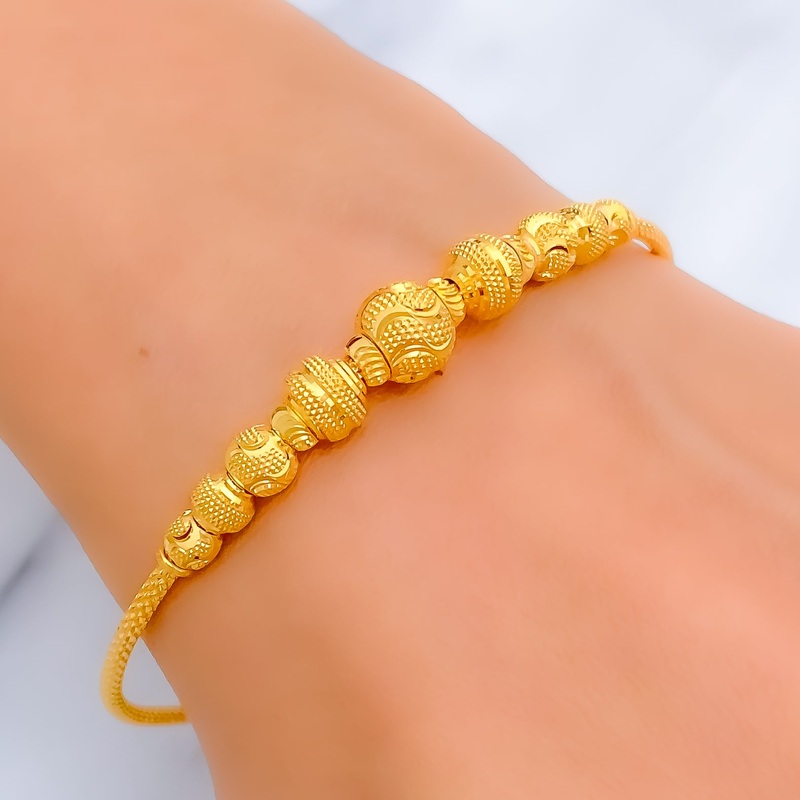 This exquisite 22k gold bangle, weighing 9.0 grams, embodies an evergreen charm. The radiant yellow gold finish enhances its classic round shape. With a 2.4-inch diameter and 0.5-inch adjustable links, it ensures a comfortable yet secure fit. Designed with