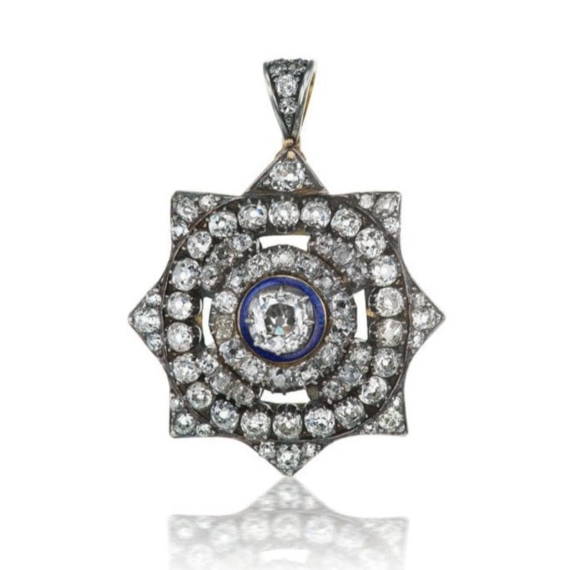The Primrose pendant is an antique diamond star pendant from the VictorianEra circa 1860.The pendant features 77 old cut diamonds set in a beautiful star shape totaling approximately7 total carats and of approximately J-K color, VS-SI clarity.The center stone is an additional approximate 0.75-caratscollet-set in silver with a halo of blue enamel.
