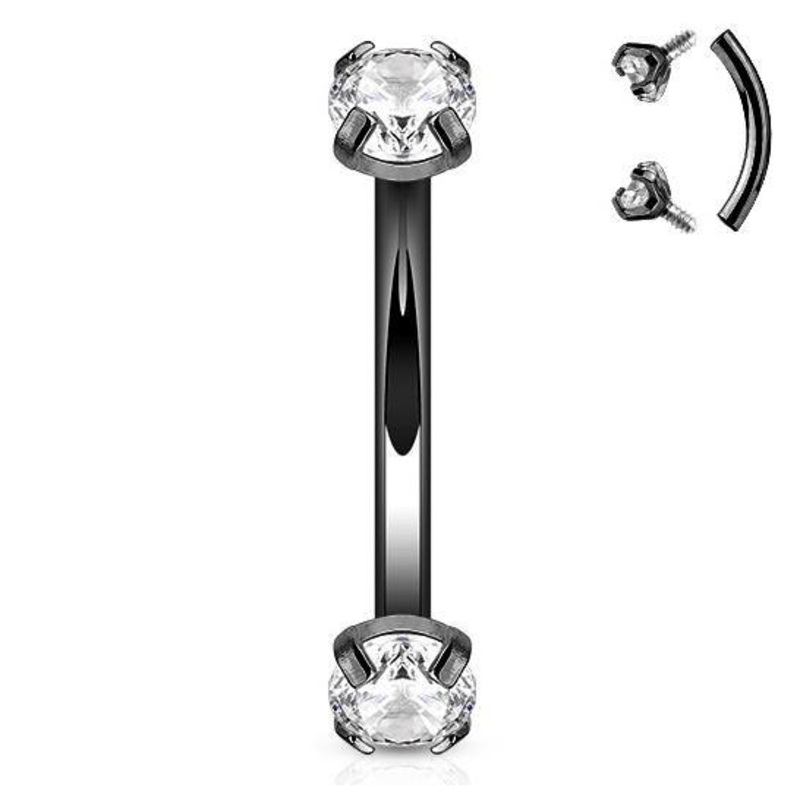 The 16 gauge cz curved barbell is made from black PVD coated 316L stainless steel with internal threading. Both 3mm prong-set ends are removable.