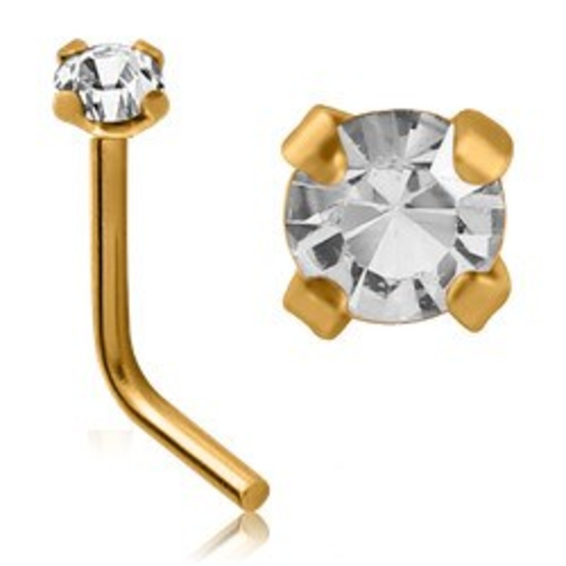 The 18 gauge L-bend nose stud is made from gold PVD coated 316L stainless steel. The prong-set cz is available in clear only. Choose your gem size below.