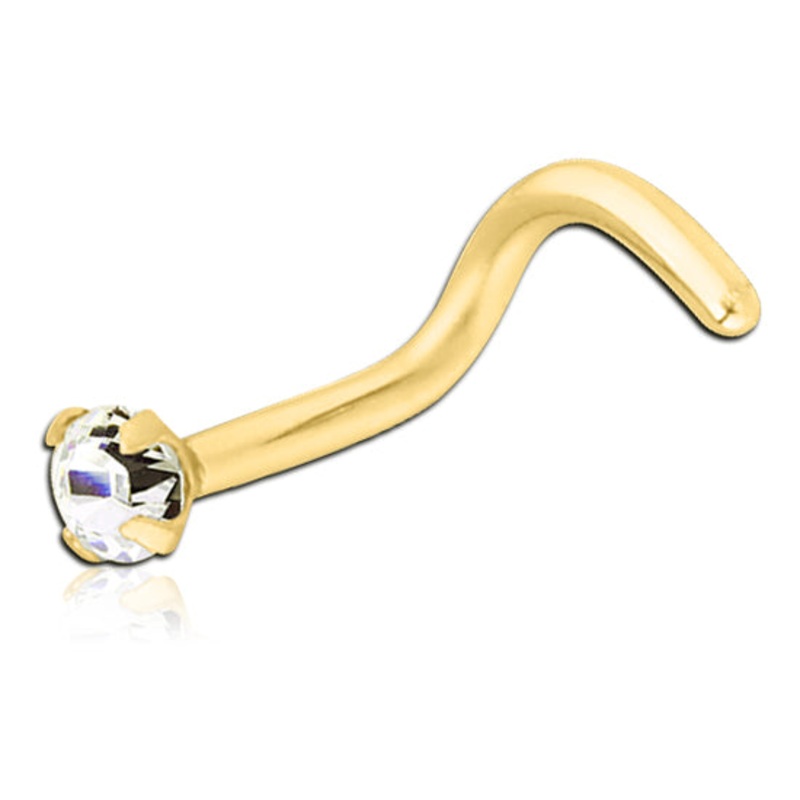 The nostril screw is made from gold PVD coated 316L stainless steel. The 2.5mm prong-set faceted gem is available in clear only.