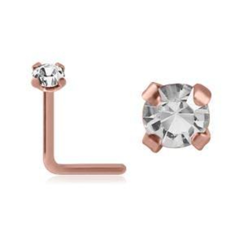 The 18 gauge L-bend nose stud is made from rose gold PVD coated 316L stainless steel. The prong-set 2mm cz is available in clear only.