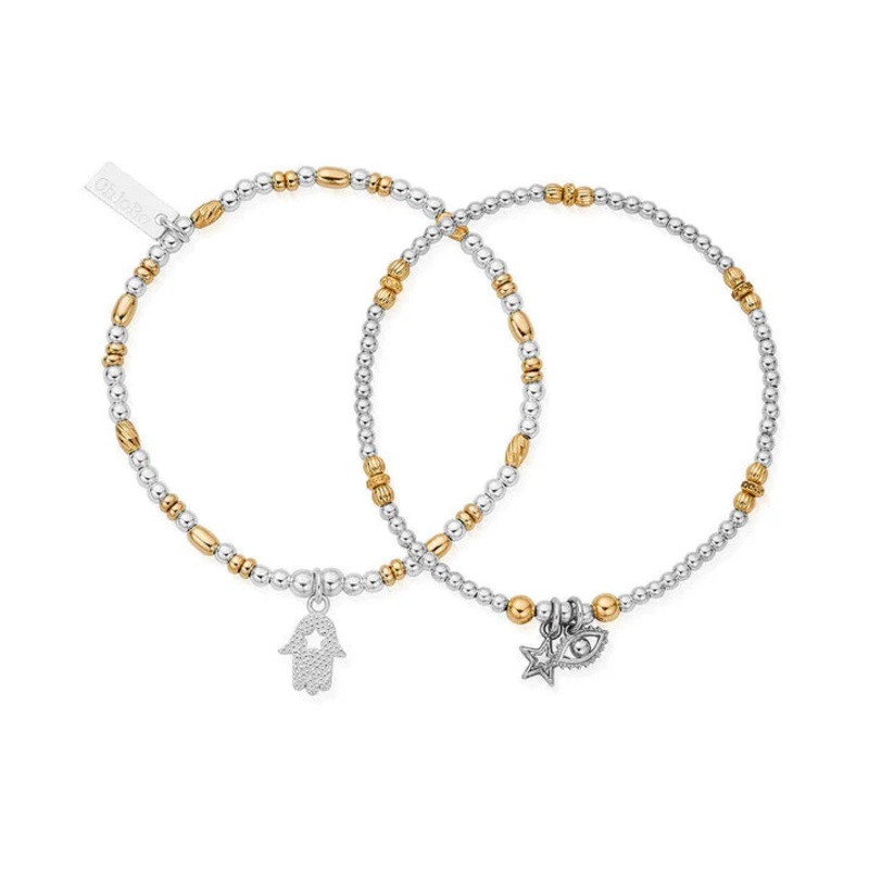 This protective pair features three detailed charms working together to bring you guidance and luck as they ward away any negative energy that surrounds you. Complementing each other beautifully, this set of 2 is a ready-made stack, featuring mixed metal beads to ensure you always stay on trend.
