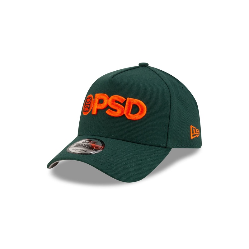 The PSD Dark Green 9FORTY A-Frame Snapback features an embroidered PSD logo at the front panels with a snapback closure at the rear and a gray undervisor.