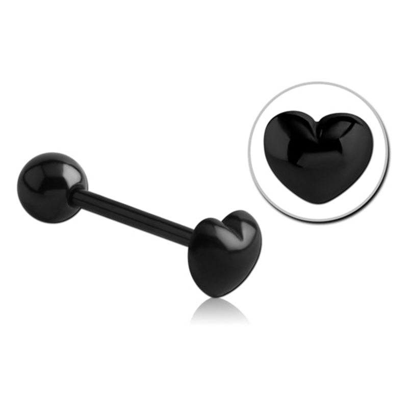 The 14 gauge puffy heart tongue ring is made from black PVD coated 316L stainless steel with external threading. The straight barbell is 5/8" long.