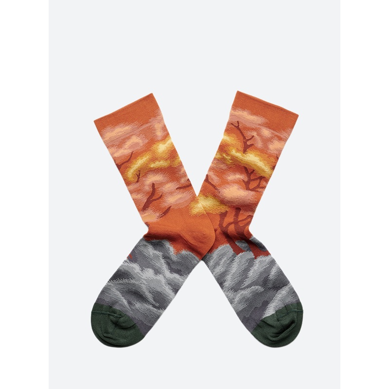 These mid-calf socks are made using premium Egyptian cotton and an elastane double thread.Chestnut brown, wilted yellow and red ochre tree on a pumpkin orange backgroundSpruce green toeMaterialsFabric Content: 90% cotton, 8% polyamide, 2% elastaneMade in F