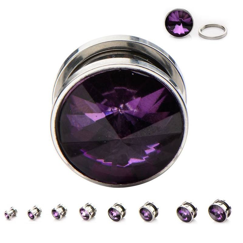 These screw-on purple cz plugs are made from 316L stainless steel with external threading. They have a wearable area of 1/4" between flares. Choose your size below.
