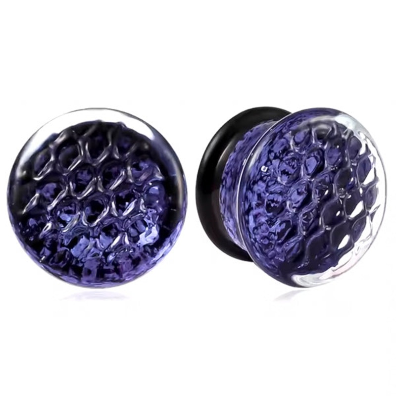 These double flare purple dichroic honeycomb plugs are made from hand blown glass. They have a wearable area of approximately 3/8″ between flares. Choose your size below.
