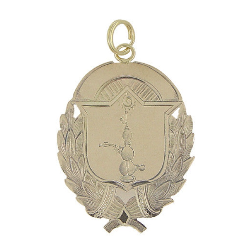 This large hand engraved antique pendant in 10K yellow gold, circa 1930's, measures 1 1/4 inch high by 1 inch wide and is inscribed on the back with "Edwin Sawhill Prize in Qualitative Analysis" and features a 14K yellow gold split ring bail that makes thi