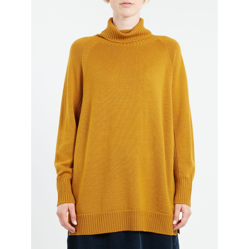 A simple raglan sleeve turtleneck knit made from a fine merino wool. The raglan sleeves provide a comfortable fit around the shoulders.