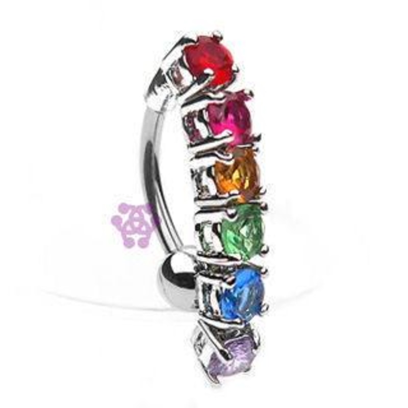 The 14 gauge rainbow gem reverse belly dangle is made from 316L stainless steel with external threading. Only the bottom 5mm ball is removable.