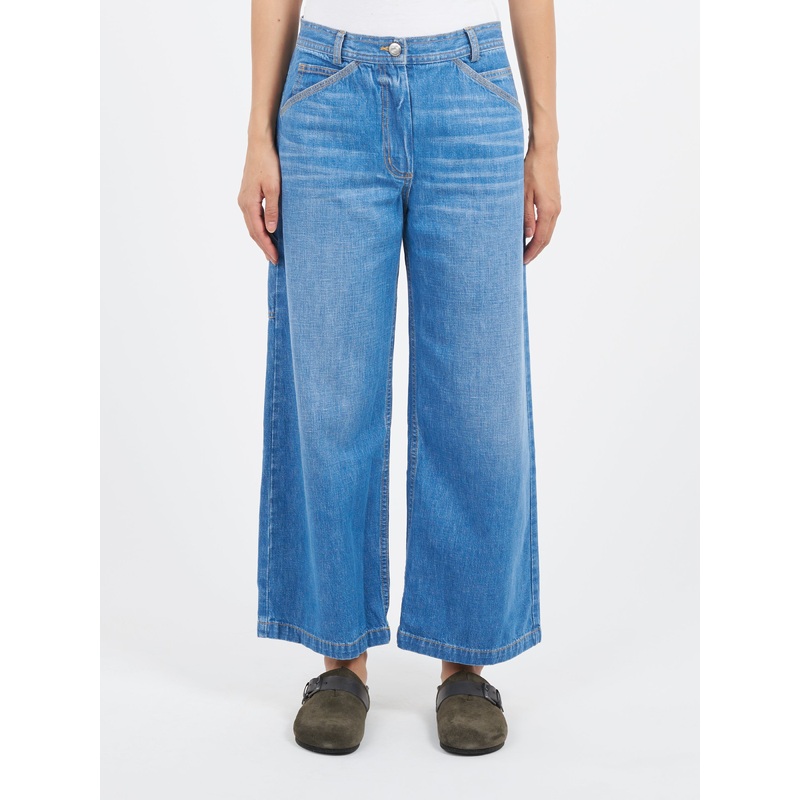 A new denim silhouette from Rachel Comey, this relaxed mid-rise, wide-leg boyfriend jean in washed Madrone Denim features diagonal slash pockets at the hip and a broken-in finish.