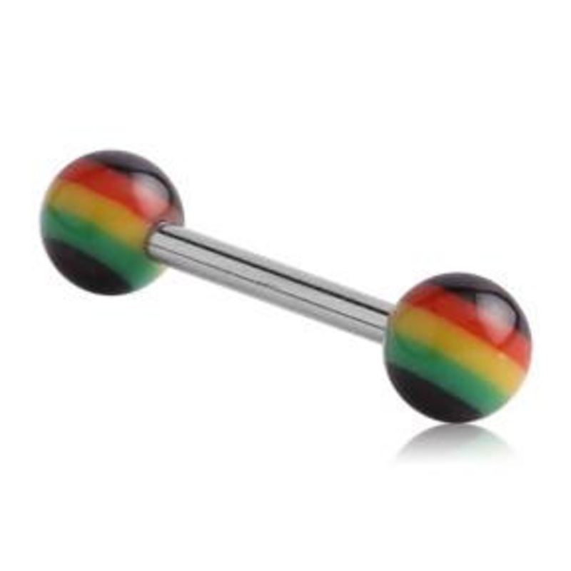 The 16 gauge rasta cartilage barbell is made from 316L stainless steel with external threading. Both 3mm striped acrylic ball ends are removable.[click here for replacement balls]