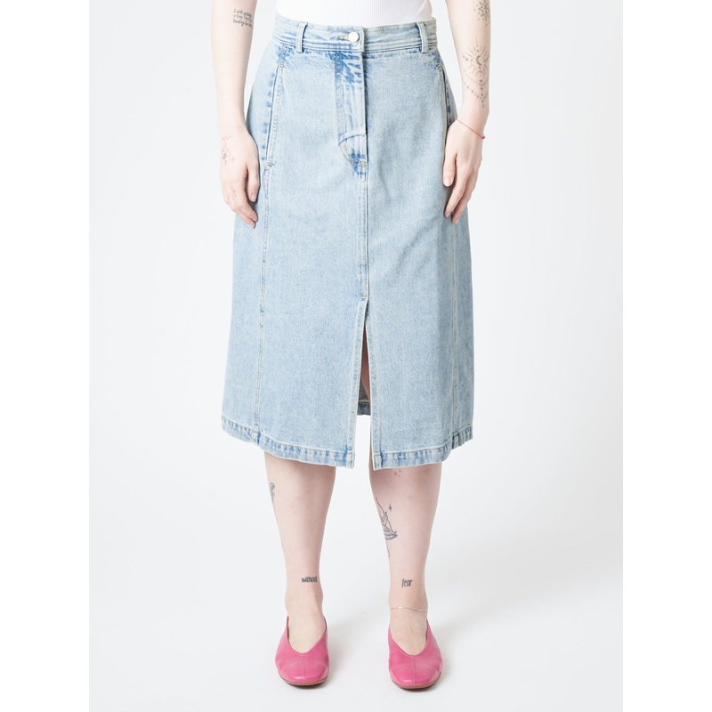 Modern midi skirt crafted from Brushed Bull Denim, featuring geometric panels at the front and rear hem for added flair and ease of movement.