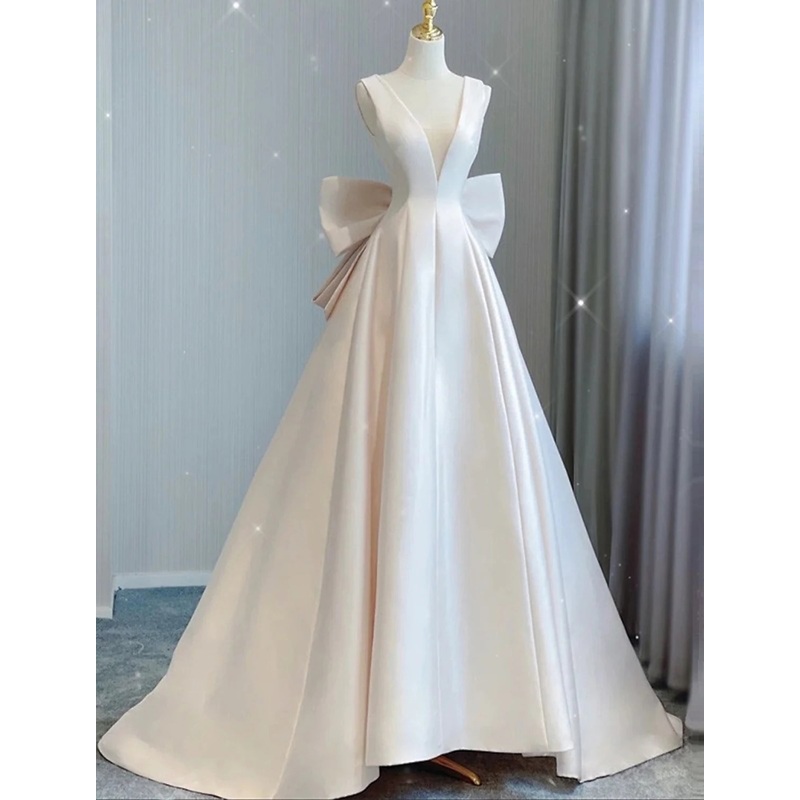 Reception Casual Wedding Dresses A-Line V Neck Sleeveless Court Train Satin Bridal Gowns With Bow(s) Pleats Summer Wedding Party Women's Clothing