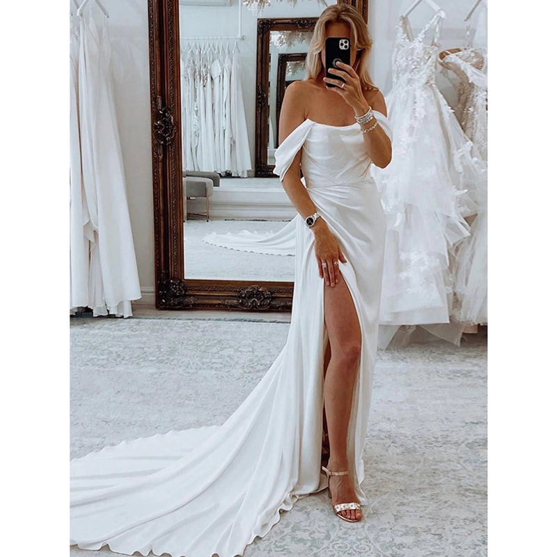 Reception Formal Wedding Dresses Sheath / Column Off Shoulder Sleeveless Court Train Fabric Bridal Suits Bridal Gowns With Pleats Ruched