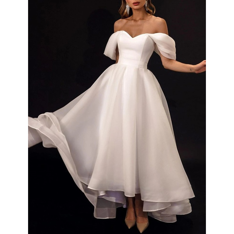 Reception Little White Dresses Wedding Dresses A-Line Off Shoulder Cap Sleeve Asymmetrical Organza Bridal Gowns With Solid Color