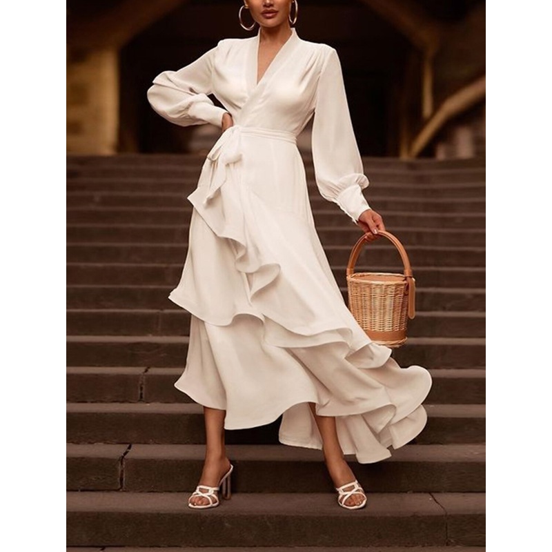 Reception Little White Dresses Wedding Dresses A-Line V Neck Long Sleeve Asymmetrical Chiffon Bridal Gowns With Cascading Ruffles Solid Color