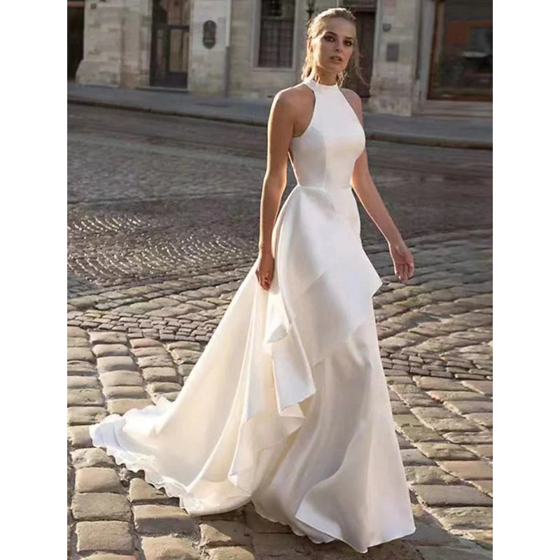 Reception Open Back Casual Wedding Dresses A-Line Halter Sleeveless Court Train Satin Bridal Gowns With Solid Color Summer Fall Wedding Party 2025, Women's Clothing