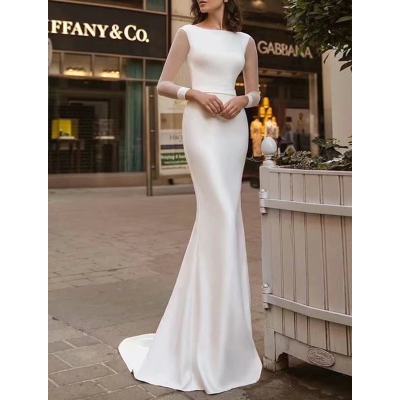 Be the first to review “Reception Royal Style Simple Wedding Dresses Mermaid / Trumpet Scoop Neck Long Sleeve Sweep / Brush Train Satin Bridal Gowns With Solid Color Summer Wedding Party”