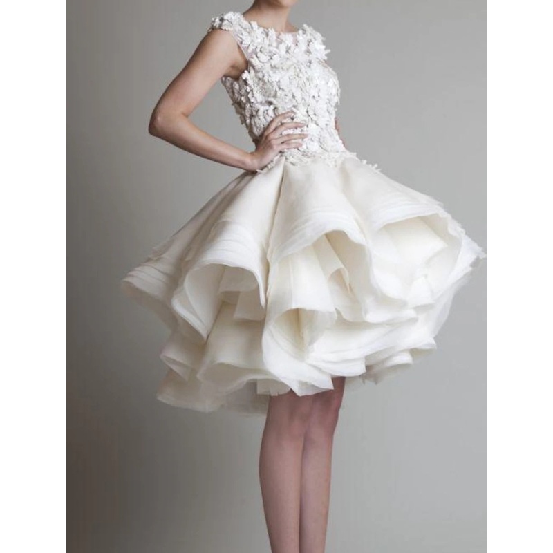 Reception Vintage 1940s / 1950s Little White Dresses Wedding Dresses A-Line Scoop Neck Sleeveless Asymmetrical Lace Bridal Gowns With Appliques Cascading Ruffles