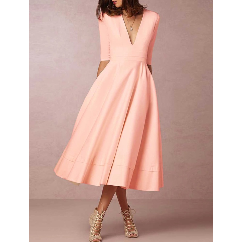 Reception Vintage 1940s / 1950s Little White Dresses Wedding Dresses A-Line V Neck Half Sleeve Tea Length Satin Bridal Gowns With Pleats White & Ivory ship in 48 hours