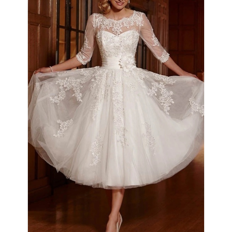 Reception Vintage 1940s / 1950s Simple Wedding Dresses Wedding Dresses A-Line V Neck Cap Sleeve Tea Length Lace Bridal Gowns With Lace Lace Insert