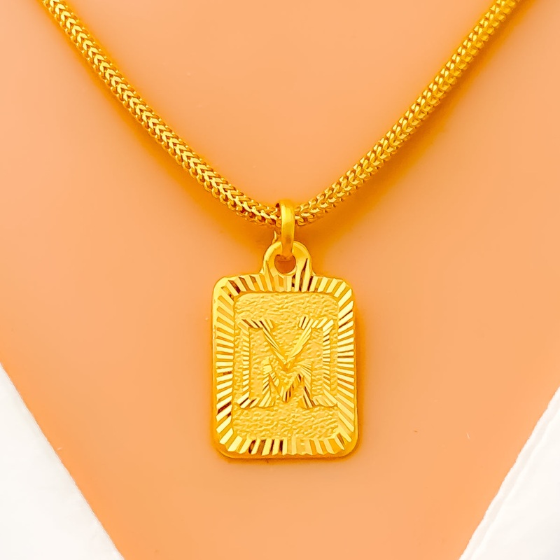 This 22k gold letter pendant, weighing 1.3 grams, features a sleek rectangular design that blends elegance with contemporary style. The polished yellow gold finish enhances its refined craftsmanship, while the 0.9-inch length offers a versatile and modern