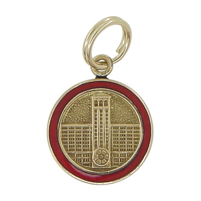 This vintage 1940's small medallion charm has an engraved surface depicting a university engineering building with red enamel framing the edge. It measures 1/2 inch high by 1/2 inch wide, with a 14K yellow gold split ring bail.