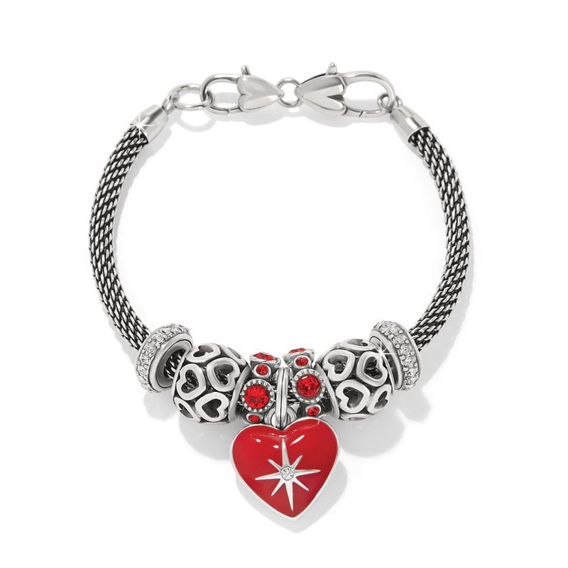 Give her a wristful of love with this bracelet dangling a hand-enameled heart charm with a starburst of fine crystals, open heart charm, plus intricately stoppers, a spacer and bead. A year round Valentine!