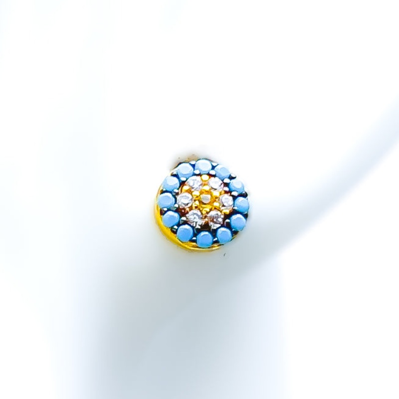 Graceful and protective, these 21k gold evil eye earrings blend elegance with symbolic meaning. Weighing 1.2 grams, their radiant yellow gold finish highlights the intricate craftsmanship, while the sparkling cubic zirconia stone adds a dazzling touch. With a compact 0.25-inch diameter, these delicately designed tops offer a subtle yet captivating presence, perfect for everyday wear. Secured with a convenient push-back post, they ensure a comfortable and secure fit. Ideal for those who appreciate refined beauty with a protective charm, these earrings make a meaningful and stylish addition to any jewelry collection.