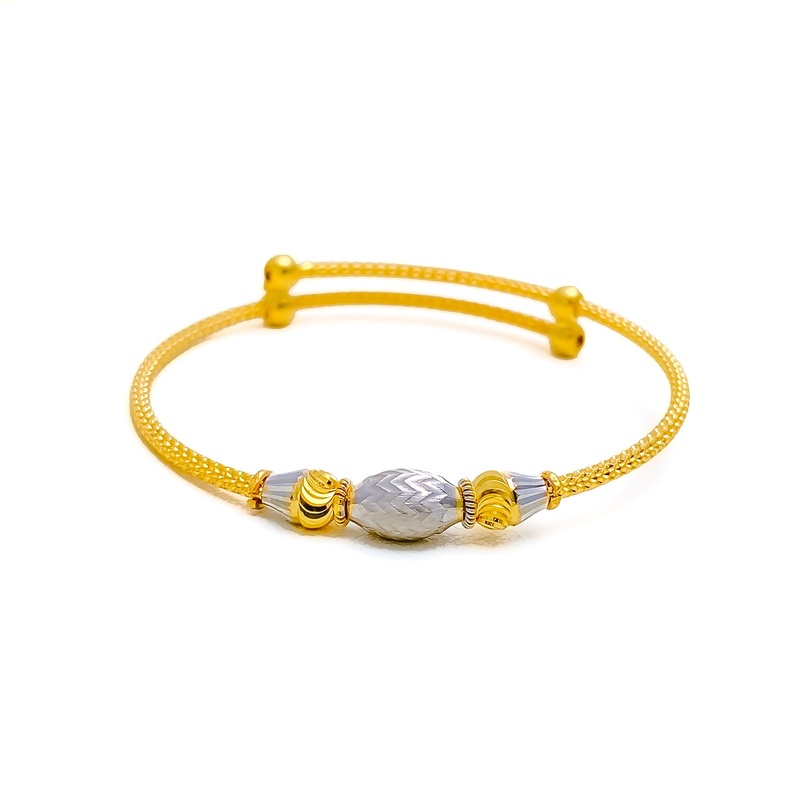 This 22k gold baby bangle exudes refined glamour with its two-tone design. Weighing 4.8 grams, it features a beautiful blend of yellow and white gold finishes. With a diameter of 1.7 inches, this adjustable bangle ensures a perfect fit for little wrists. I