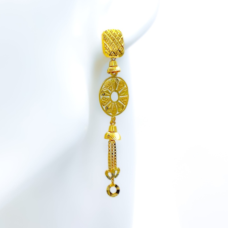 Boasting a reflective checkered pattern, these 22k gold earrings weigh 5.4 grams. Their design is enhanced by a vibrant yellow gold finish, creating an eye-catching effect. Each earring is 2.5 inches long, featuring a hanging style that adds movement and e