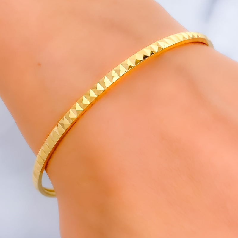 The Reflective Faceted 22k Gold Bangle, weighing 11.2 grams, is a stunning display of contemporary elegance. Made from 22k gold, it boasts a radiant yellow gold finish that perfectly complements the faceted design, creating a captivating play of light. Thi