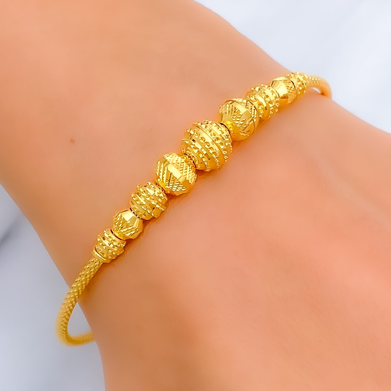 This 22K gold bangle bracelet features a sleek striped design, adding a radiant touch to any collection. Weighing 8.9 grams, it has a round 2.4-inch diameter with adjustable 0.5-inch links for a comfortable and flexible fit. The polished yellow gold finish