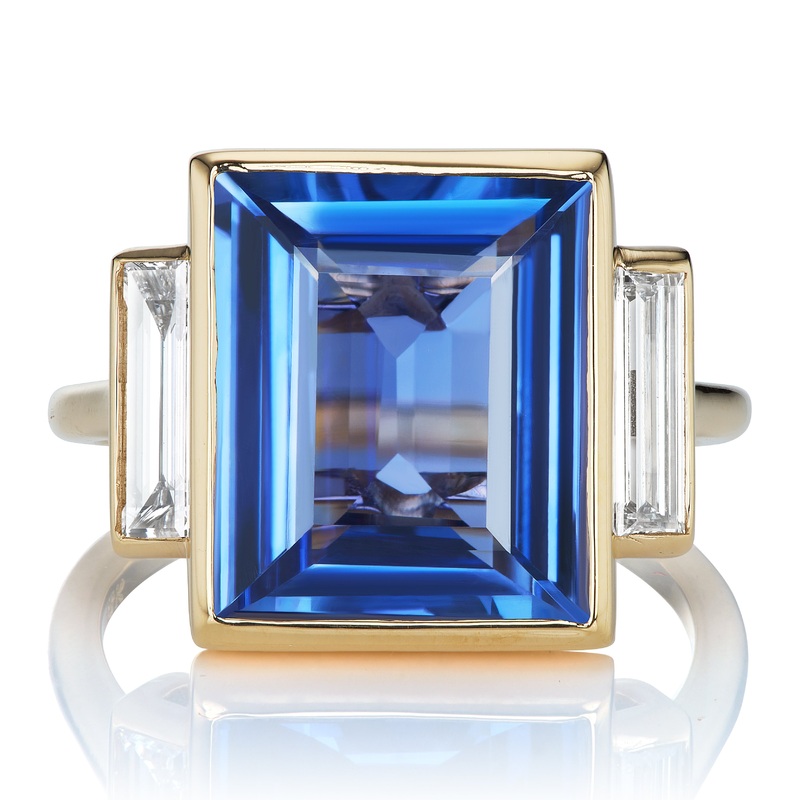 TheRemmy 6.95 ring is an AB original design made right here in NYC. The ring centers a C Dunaigre-certified 6.95-carat rectangular cut heated Sri Lanka sapphire. A sleek baguette is set vertically to either side of the sapphire combing for 0.44-carats. The stones are bezel set in an 18kt yellow gold setting. The ring is currently size6 and can be resized!