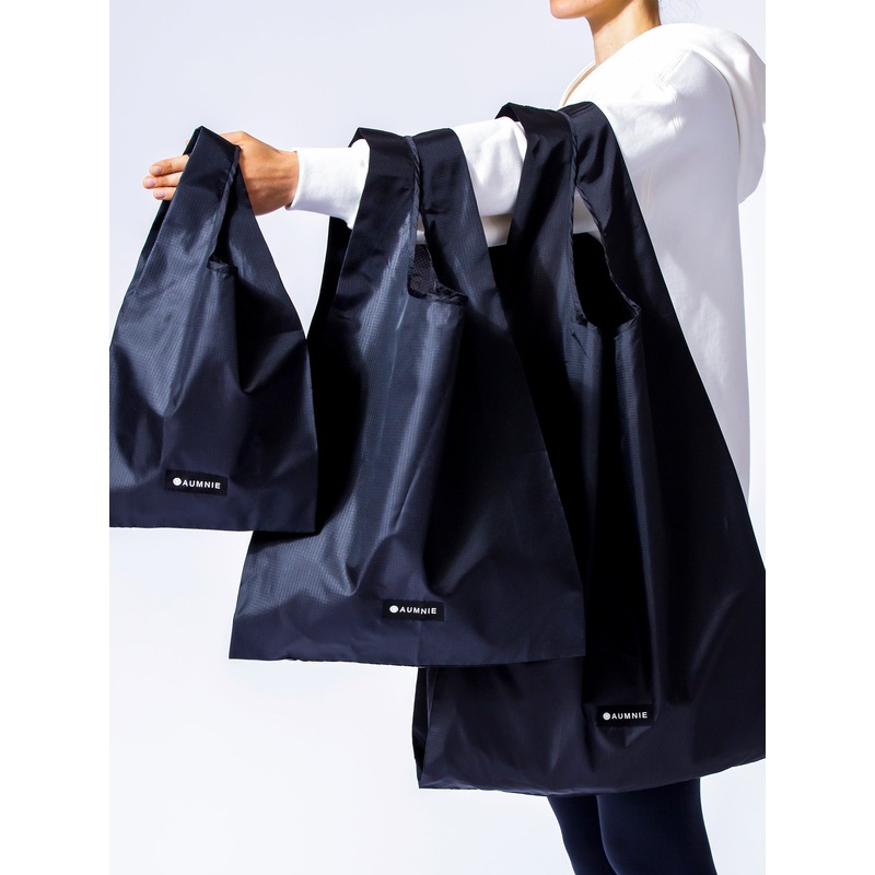 Lightweight waterproof ripstop nylon with a fold-and-tie design and elastic logo strap to secure the fold. Versatile shape for everyday use. Finished with a subtle AUMNIE logo on the front. Perfectly practical yet refined, its a chic companion for everyday sustainability.