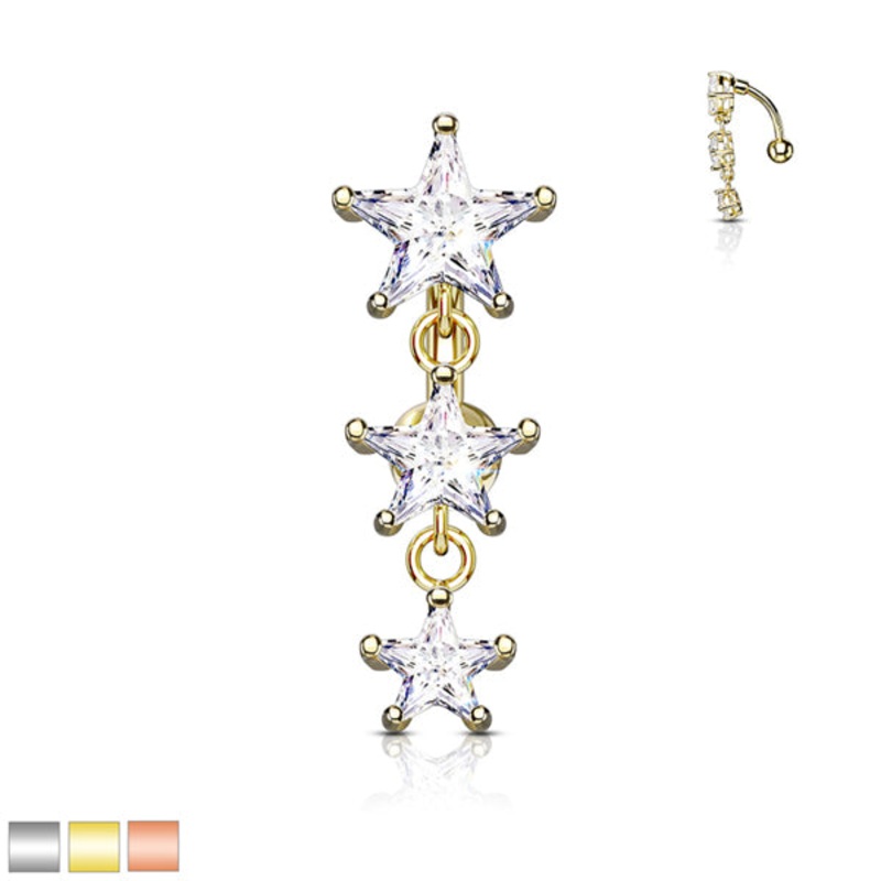 The 14 gauge reverse star cz belly dangle is made from 316L stainless steel with external threading. Only the 5mm bottom ball is removable. Choose your finish below.