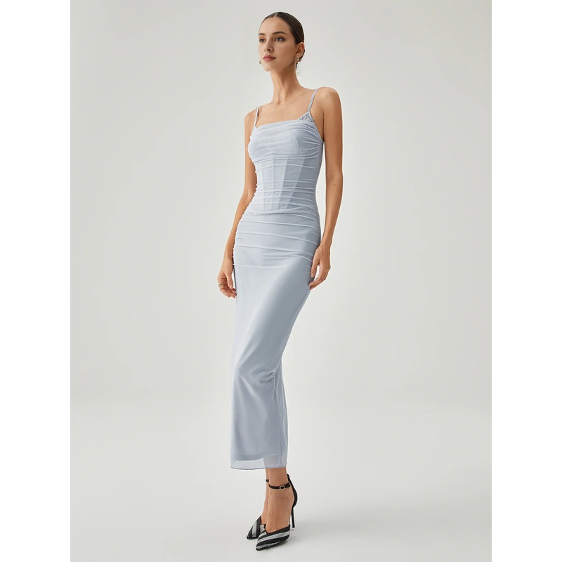 Ribbed hanging slit mesh vest long gowns even dresses