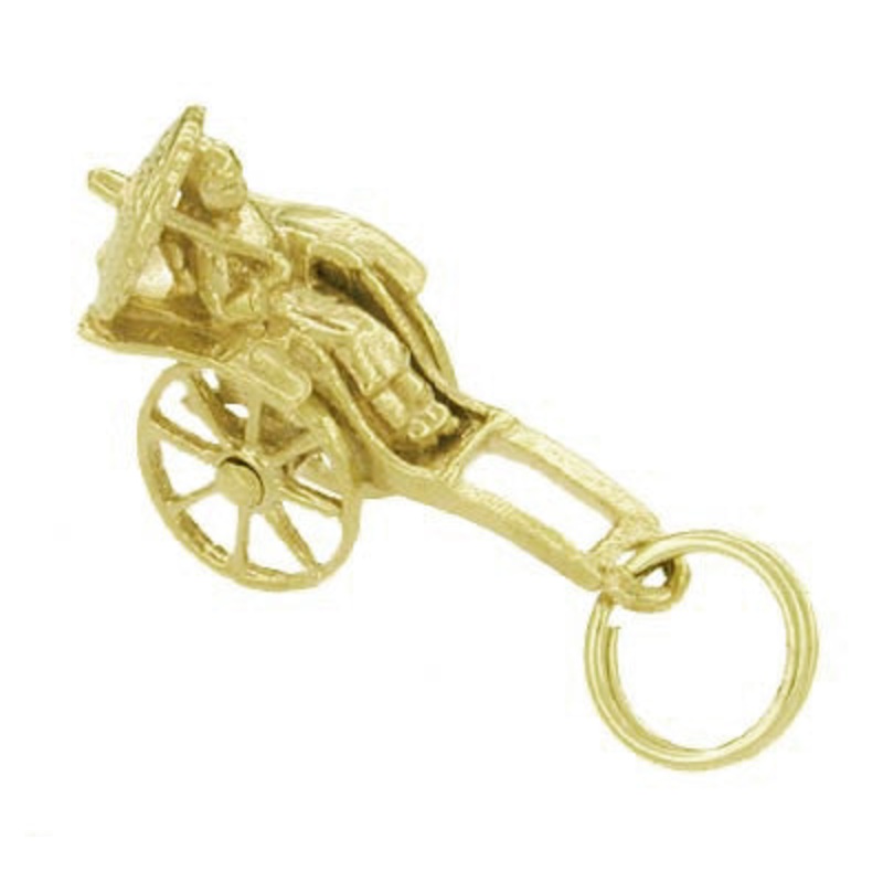 A time honored symbolof thehistory of the Orient, one can just imagine this lovely Asian maiden whirring elegantly through falling blossoms in this rickshaw with wheels that actually turn! Let this lustrous 14K yellow gold pendant, circa 1950’s, whisk you back to your own bright days in the Far East or on a dreamy ride in anticipation of your travels far and wide. This gorgeous vintage charm measures 11/16 inch high by 7/8 inch wide and features a large 14K yellow gold split ring bail that easily and securely attaches this charm to your favorite neck chain or unique charm bracelet.
