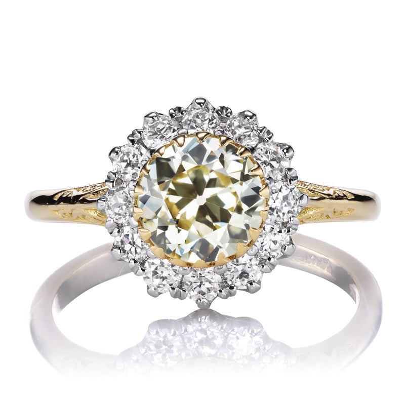 Fancy Yellow Antique Diamond with Halo of DiamondsThe Riley 1.30 ring is an AB original design made right here in NYC. The ring centers a GIA-certified 1.30 carat Transitional Cut diamond of Fancy Yellow color, VVS2 clarity. A halo of 12 Old European Cut d